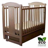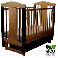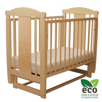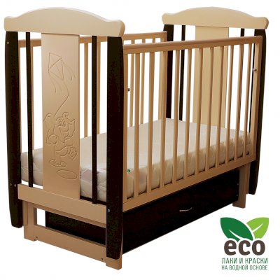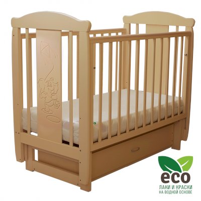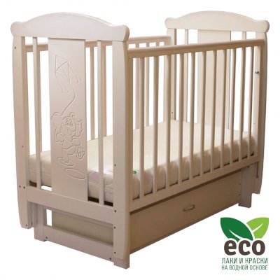 Кроватка декорирована фрезерным рисунком "Слоник". Уникальные фрезерные рисунки размером от 50 см на обеих спинках.