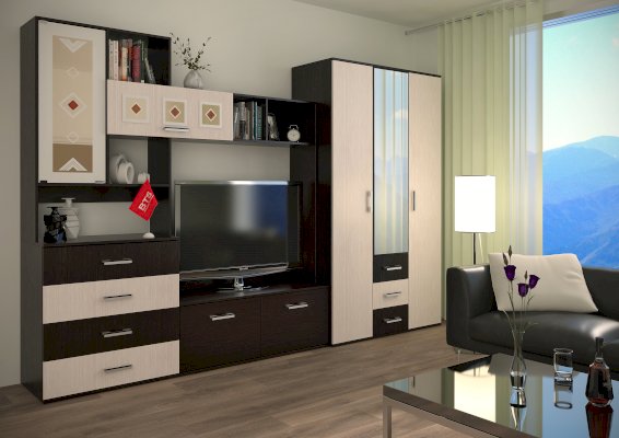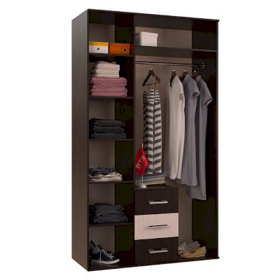 Модель имеет отделение с хромированной штангой для одежды на вешалках, три выдвижных ящика, а также зону с полками. На центральный фасад прикреплено высокое зеркало. Изделие выполнено из ЛДСП, дополнено эргономичными ручками.