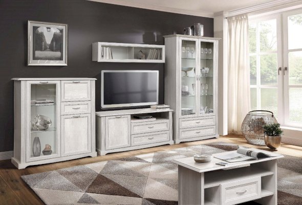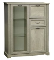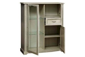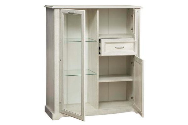Данная модель – вариация комбинированного шкафа 32.05 и витрины 32.06. И от каждой модели она взяла только лучшее: небольшой выдвижной ящик, который удобно расположился между верхним и нижним отсеками с распашными дверцами – как раз на уровне вытянутой руки – его очень удобно открывать, не нужно нагибаться или, наоборот, вытягиваться вверх. Вещи, помещенные в него, находятся на уровне глаз. Сверху и снизу за распашными закрытыми дверцами находятся отсеки с полками из ЛДСП, а слева – отсек-витрина со стеклянной дверцей. Полки из ЛДСП выдерживают нагрузку до 5 кг, стеклянные – до 3 кг.