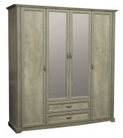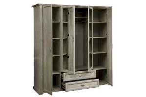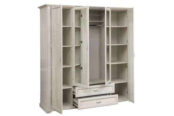 Данная модель – настоящая мини-гардеробная и отличная альтернатива целой комнате, ведь в нем поместится вся ваша одежда – и не только! Все в нем учтено до мелочей. Распашные двери – две глухие по краям и две зеркальные в центре – удобны и практичны. Внутреннее пространство продумано и зонировано. По краям, справа и слева расположились полки, на которых можно разместить одежду, а также коробки-боксы с вещами или обувью. В каждом отсеке находится по 5 полок, что оптимально по высоте: четыре полки в свободной зоне доступа даже для человека с маленьким ростом, а пятая, верхняя – для тех, кто повыше. Так что, если вы обладаете высоким ростом, у вас есть явные преимущества – это будет только ваше пространство! Каждая полка выдерживает до 5 кг – это достаточно для большого количества вещей. Глухие двери скроют от посторонних глаз то, что для них не предназначено. Центральные дверцы шкафа – зеркальные, это избавляет владельцев шкафа приобретать отдельное зеркало. Наверху расположена удобная горизонтальная полка, которая служит в качестве антресоли, куда можно убрать сезонные вещи, либо предметы, которыми хозяева пользуются не так часто. Центральный отсек снабжен металлической штангой, которая выдерживает вес до 20 кг, и предназначен для одежды на вешалках. Можно надеть любимое платье или костюм, закрыть шкаф и тут же оценить себя в зеркале. Очень удобно! Два выдвижных ящика под центральным отсеком подойдут как для вещей, так и для обуви – это зависит от помещения, где расположен шкаф. Если он находится в спальне, то в ящиках можно разместить белье – один отсек для НЕЕ, другой – для НЕГО, а если в холле или в прихожей, то в ящиках поместится обувь всей семьи. Благодаря современным технологиям дверцам и выдвижным ящикам не нужны доводчики – они легко и дружелюбно распахиваются и выдвигаются навстречу по первому желанию хозяев. Шариковые направляющие обеспечивают очень плавный ход. Дверцы и ящики снабжены металлическими ручками, которые учитывают анатомию ладони, поэтому ими очень удобно пользоваться.